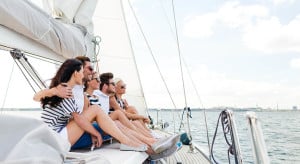 smiling friends sitting on yacht deck